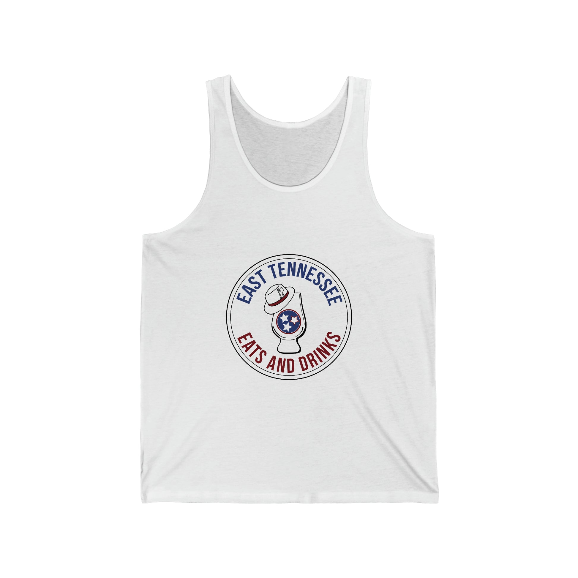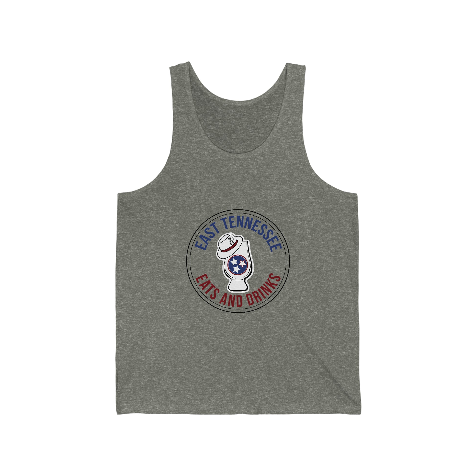 This must-have unisex jersey tank top fits like a well-loved favorite - maybe like a favorite meal at one of East Tennessee Eats and Drinks favorites haunts. High quality print makes it an ultimate statement shirt for years to come. This item has side seams to provide structural support. All bindings are the same fabric as the rest of the tank. Depending on the color, cotton, polyester, or rayon can appear.
